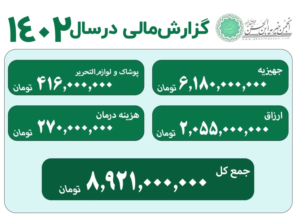 انجمن خیریه با حمایت شما خیرین عزیز، در سال ۱۴۰۲ توانست گامهای موثری در راستای کمک به نیازمندان بردارد. در این سال، کمکهای مردمی در بخشهای مختلف هزینه شد تا خانوادههای کمبضاعت از حمایتهای لازم برخوردار شوند. جزئیات این هزینهها به شرح زیر است: